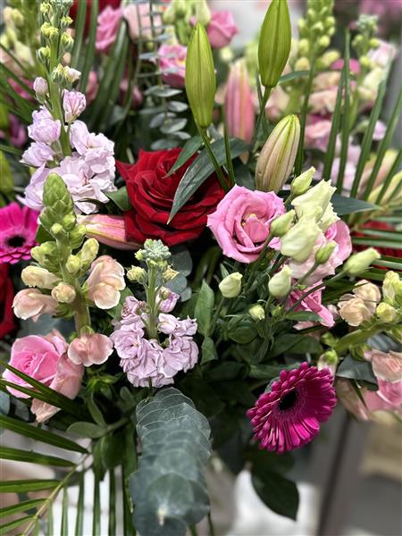 Featuring Roses, Lisianthus, Lilies, Stocks, Snapdragons, Gerbera and lux foliages, displayed in this gorgeous churn style glass vase.