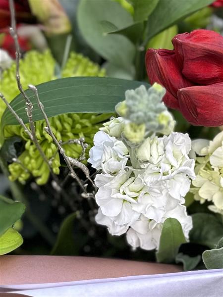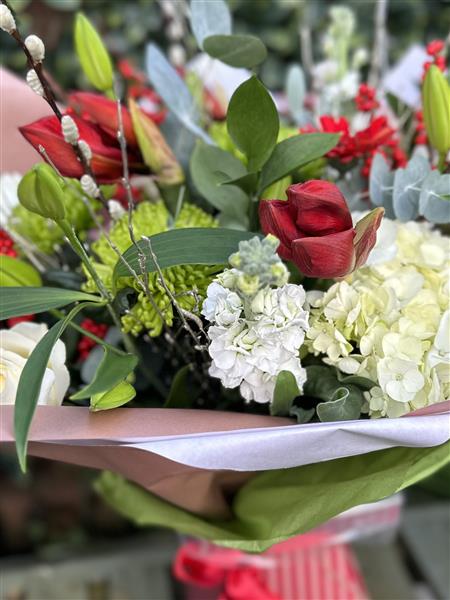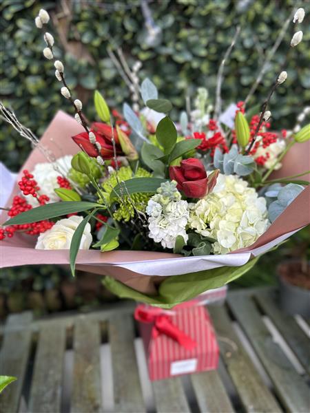 A beautiful hand tied bouquet made with a florist choice mix of festive reds, greens and whites. We will pick the very best flowers and foliages and adorn with sticks and festive bits to create a stunning floral arrangement for the festive season.