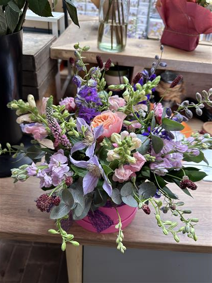 Hatbox arrangement in a colourful box, chosen and designed by us. If you have a colour preference please put in the comments box.