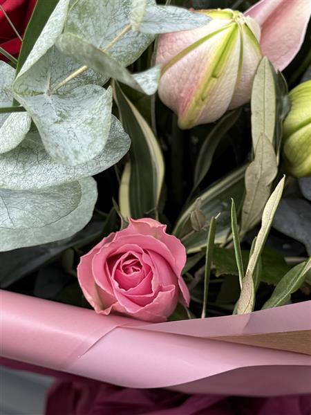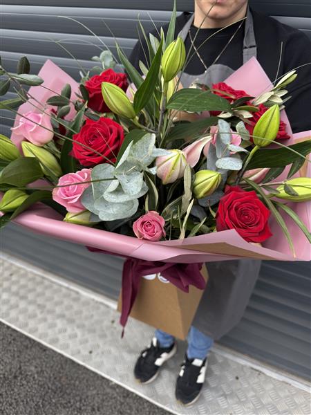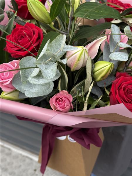 6 finest Porta Nova Red Naomi Roses, 6 Pink Roses, with extra large pink oriental Lily expertly hand tied with the most sumptuous foliages including Eucalyptus.