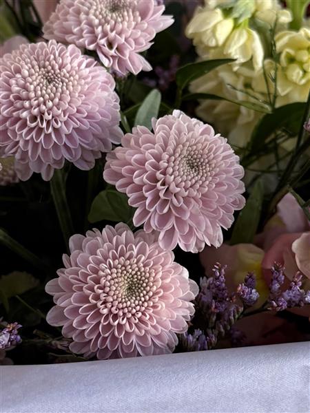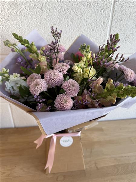 Beautifully selected mixed flowers- what's best in that day in the colour palette you choose, with foliage and arranged into our mini living vase.