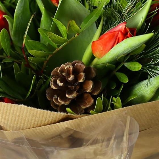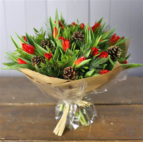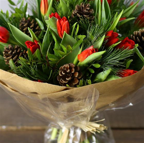 A chunky hand tied posy of red Dutch tulips, pines cones and seasonal foliage. In the words of Anto Sharp, 'oooh that's going straight in my basket!'